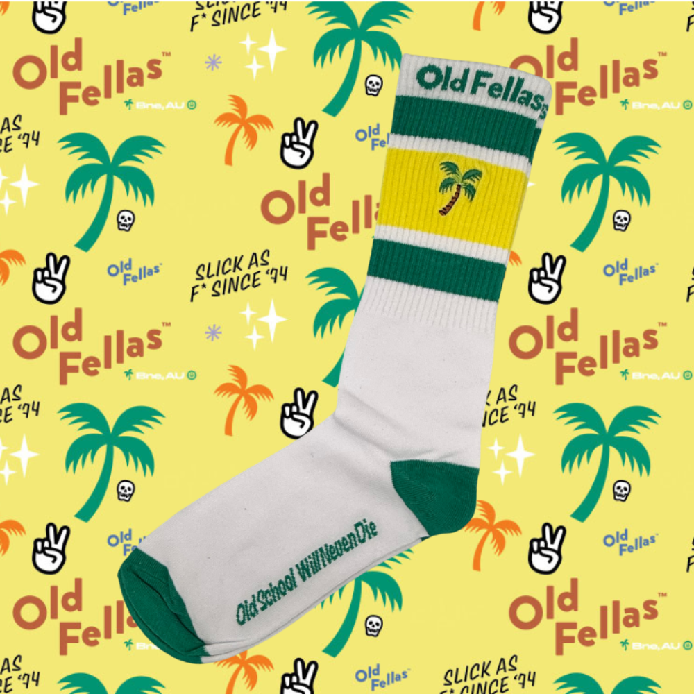 Step into the Old Fellas lifestyle with these premium retro-inspired socks. Featuring our signature green and yellow stripe design with the iconic palm tree logo, these socks bring that authentic old school vibe to your everyday wardrobe.